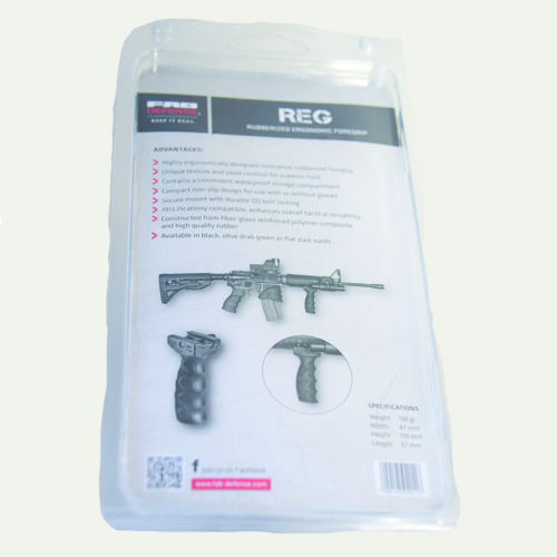 ידית הסתערות קדמית של חברת fab defense דגם REG. הידית עשויה פולימר עם ציפוי גומי. הידית מעוצבת ארגונומית ונוחה לאחיזה. מתחת לידית יש פתח אחסון לסוללות.